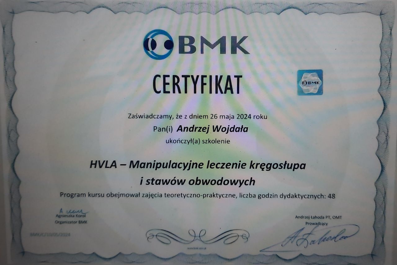 Wizyta u p. Andrzeja przypomniała mi, co to znaczy udać się na konsultację do specjalisty. Przyniosłam ze sobą płytę z prześwietleniem i opis wykonany przez radiologa. Oba dostarczone materiały zostały przeegzaminowane w najdrobniejszym szczególe wraz ze szczegółowym, ale i bardzo przystępnym komentarzem. Udzieliłam drobiazgowego wywiadu dotyczącego mojego zdrowia. Następnie pan Andrzej sprawdził, jak mój kręgosłup zachowuje się 'w akcji', jak również mobilność stawów kończyn dolnych i miednicy, cały czas objaśniając co i dlaczego jest ważne, aby zachować zdrowie kręgosłupa. Na końcu wizyty otrzymałam zestaw ćwiczeń do wykonywania w domu, ponownie z objaśnieniem i osobistą prezentacją. Zaordynowana terapia skutkuje, czuję się zdecydowanie lepiej, nie tylko w kwestii bólu kręgosłupa, ale kondycji fizycznej w ogóle. Polecam wszystkim!!!